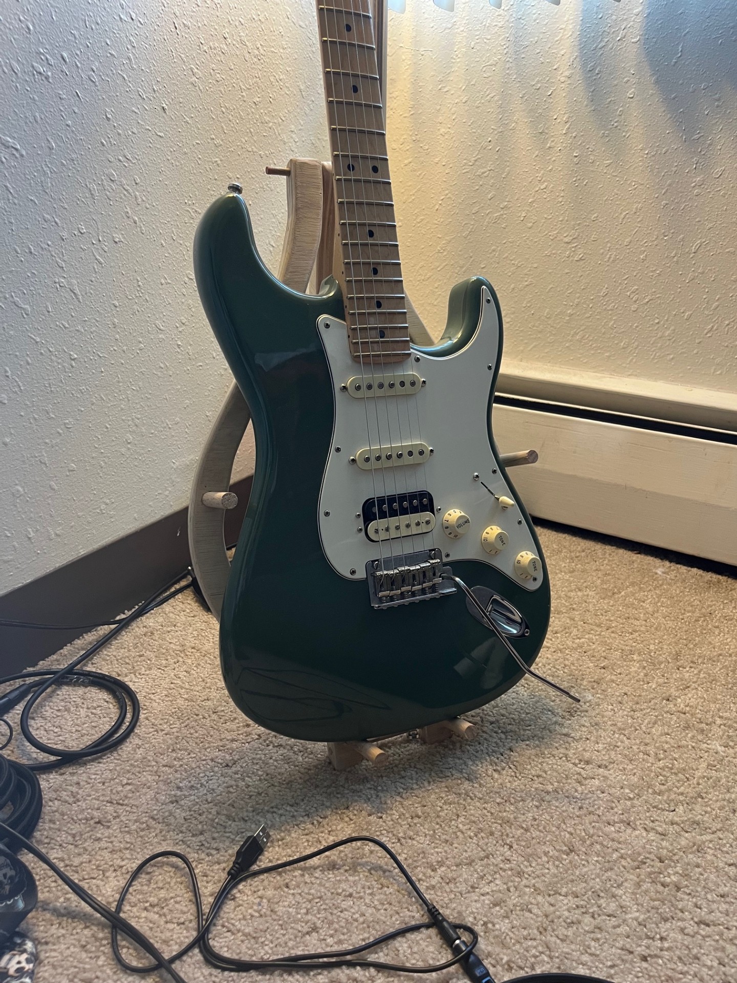 I’m tired of leaning my guitar against the wall and worrying about it falling over, but most guitar stands look like the image to the left which I find very ugly. Some stands can be less of an eyesore with more natural materials and simpler more minimalistic designs as seen in the center image. These usually aren’t great stands and aren’t very functional either. Some stands, like the one on the right solve both problems without becoming terribly complex.