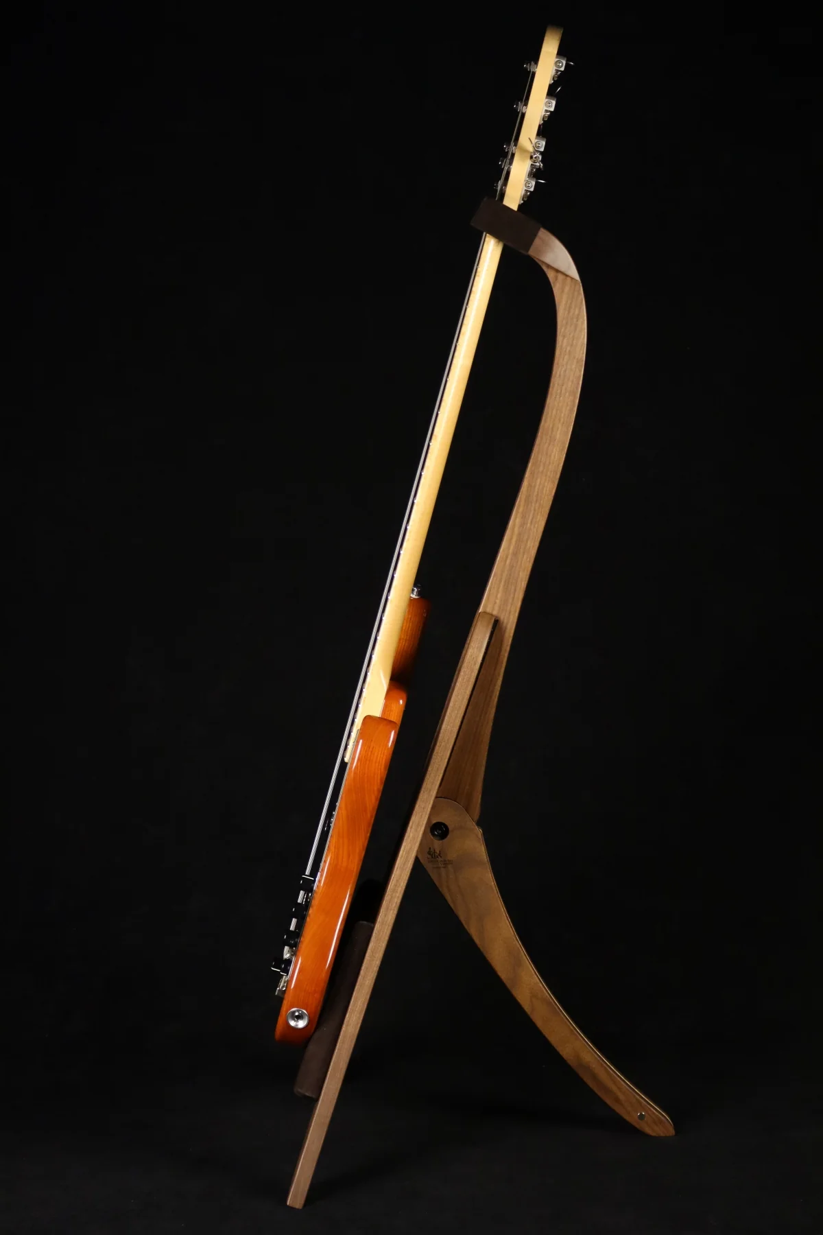 This addition of a third arm as the support not only matches the rest of the curves of the piece but allows for an adjustment of angle as well. Most of the weight of the guitar is transmitted down onto the lowest pegs placing very little pressure on the third arm which is mostly for balance.