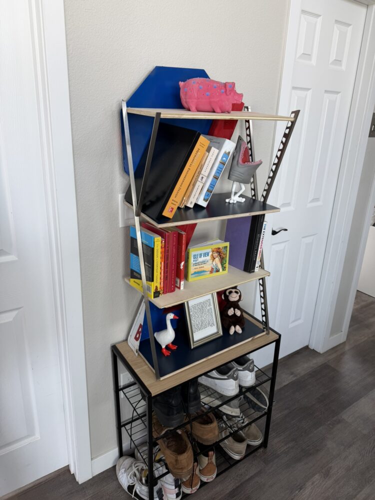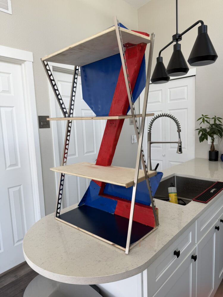 The finished bookshelf, titled re/strata, reflects Constructivist principles through exposed steel supports, bold red and blue planes, and clear load paths. One of its strongest qualities is its visual lightness. Unlike most bookshelves, which appear bulky from the side, this design feels open and airy due to the slender metal supports and minimal framing. The vibrant colors give it energy, while the reclaimed materials ground it in practicality and sustainability.