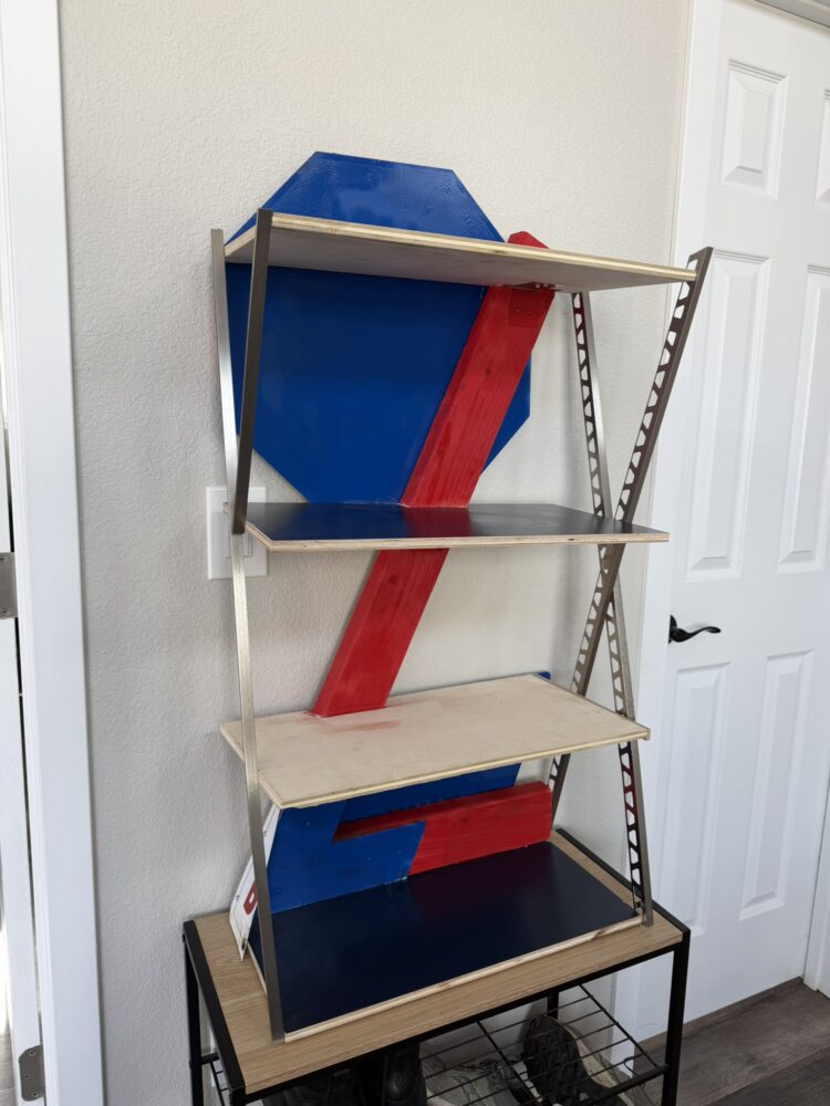 There were some connection challenges. Trim screws caused splitting in the plywood end grain and limited fine adjustments, so I switched to trim nails and drilled through the braces instead. While the structure is very solid and exhibits almost no side-to-side flex, I am aware that end-grain fastenings may not perform optimally under extreme loads. In future iterations, I would incorporate notch lap joints between shelves and frame members to improve alignment and increase structural integrity. I would also paint components prior to final assembly and potentially use a continuous metal rod system for brace connections.