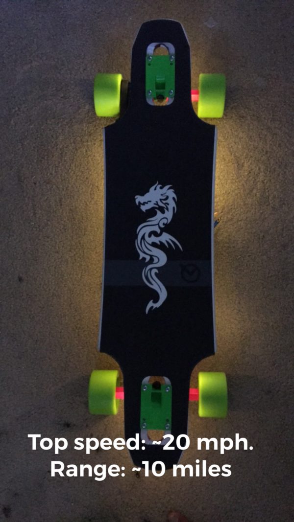 I built an electric longboard designed to travel at a maximum speed of 20 mph with a range of 10 miles.