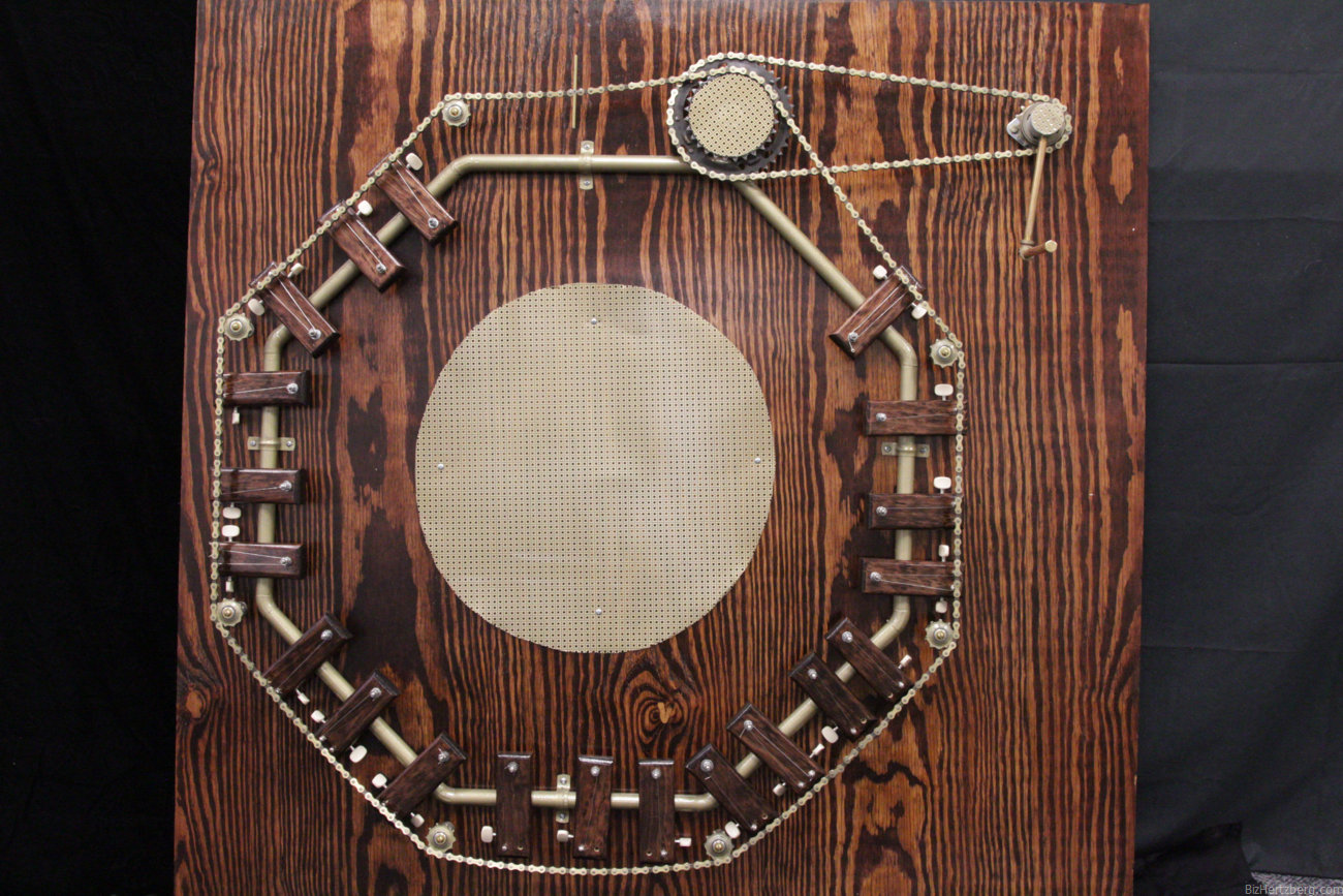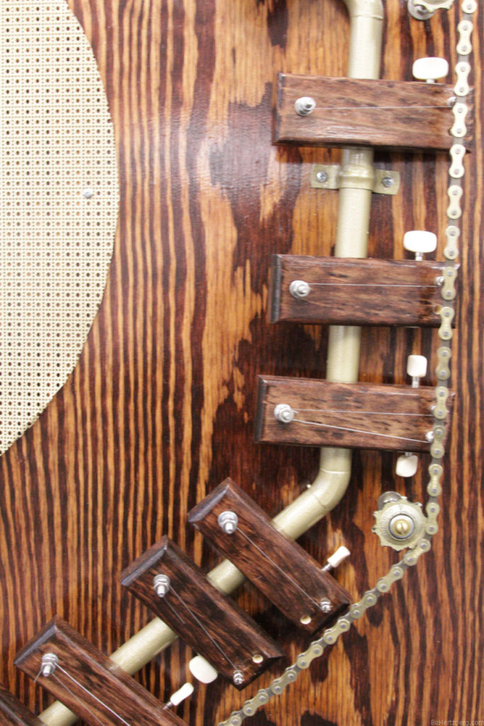 This semester, I created a wall mounted piece motivated by the old fashioned crank music box. My version was old school jazz themed, and while keeping the crank operated theme I went with a different type of note generation, having a plucker run across guitar strings tuned to different notes.
