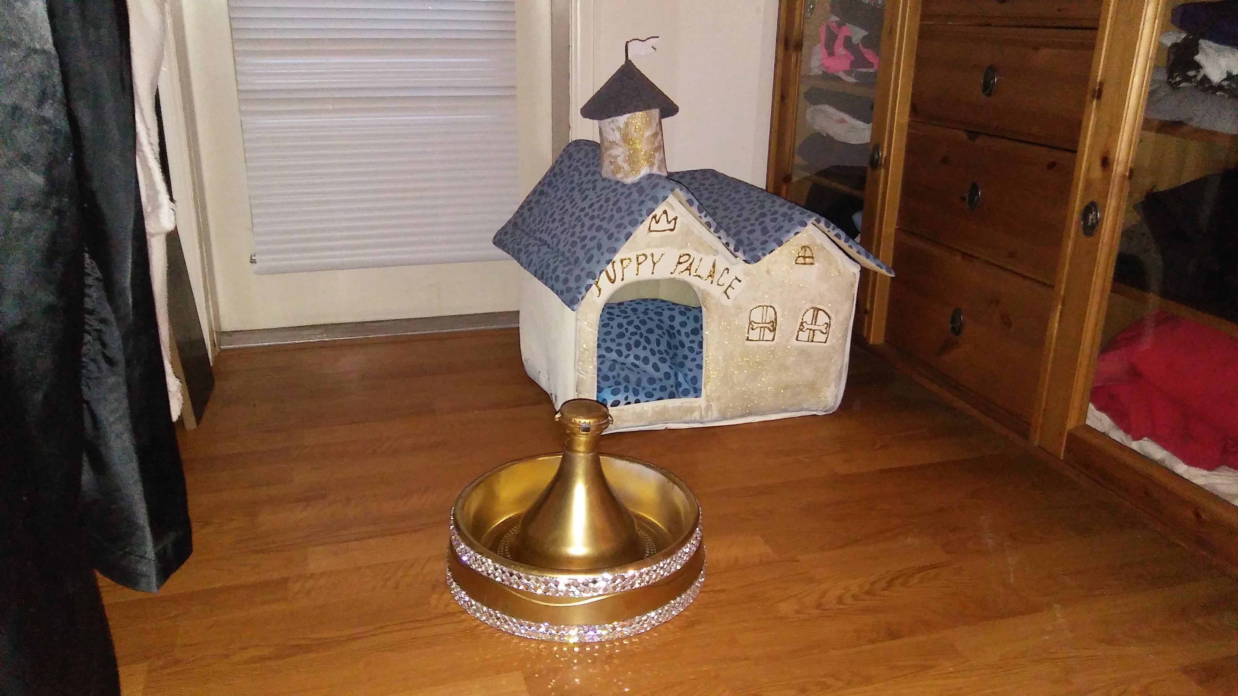 The puppy palace aesthetic was envisioned in French palatial Louis XVI style.  Other aesthetics considered were colonial, modern, and organic.  For the specific puppy, breed, size, and space the Louis XVI aesthetic was chosen as the best fit.