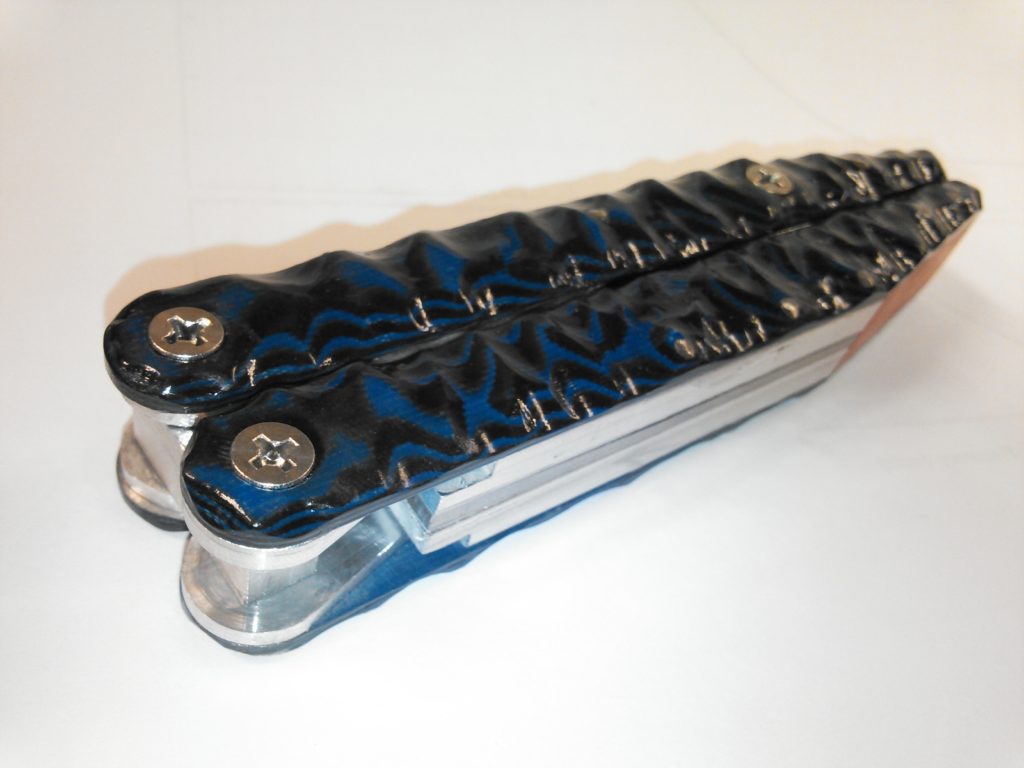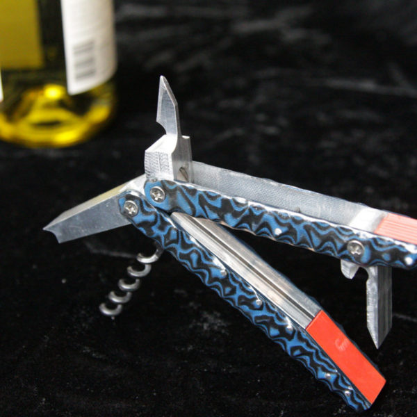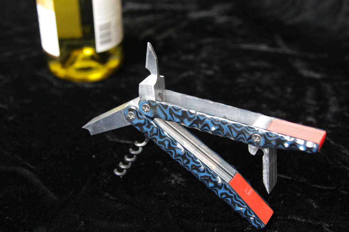 I present the Wine Knife, an aesthetic upgrade to the typical servers wine key, given the knife like function, machined aluminum craftsmanship, and single pull design. The hand crafted G-10 scales draw in the eye with a striking black and blue wave patterning while concealing the main components, tooth, screw, foil knife, and bottle opener, each cut from 6061 Aluminum.
