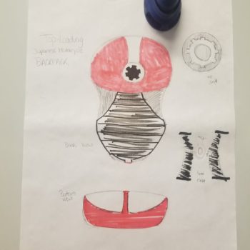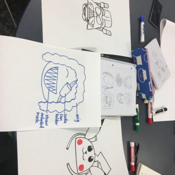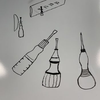 With Greg Whiting we explored an ideation technique in which we picked a noun from one small box and an aesthetic from another. Regardless of their randomness, our task was to pair them together and redesign that noun with the aesthetic that we drew. After 10-15 minutes we were asked to draw our new design…