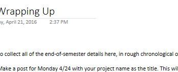 Hi. I’ll try to collect all of the end-of-semester details here, in rough chronological order. Make a post for Monday 4/24 with your project name as the title. This will be a placeholder for your presentation video only, so your pod can comment on your presentation regardless of the state of your final blog…