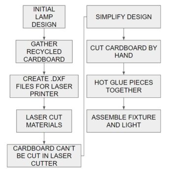 Above is my design loop reality. In retrospective, I should have gone to the laser cutter first to see the approved materials list. Waiting until the last minute put me in a bind and although I am happy with the final product I believe that the design could have been more elaborate with the aid of…
