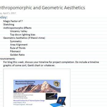 Today we talked about the Magic Factor of 7, needed for planning time management. Also covered a bit about sketching horizontal cylinders, and then finished the anthropomorphic aesthetics. Covered the geometric aesthetics except for Golden Ratio; that will be Friday. 24 Anthropomorphic and Geometric Aesthetics