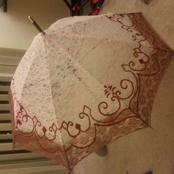Somehow I forgot to post this, so here we go! The last and final update! Now that all of the lace and brown dye have been applied to the parasol, all that is left is painting on the design. However, testing the lace with extra scrape lace showed that I would not be able to…
