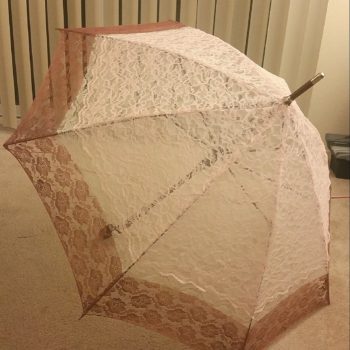 I had a very busy weekend so I did not get as much done as I had hoped. However, all of the initial sewing is done! Basically, the current status is that the eight “petals” are cut and sewn together and they are almost attached to the umbrella frame itself. The pink lace decoration is…