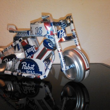 Sketch based upon can wheel side and photo Here it is the #16 PBR racer, complete with rolling wheels, rear suspension, and movable steering. The motorcycle is designed as a cafe racer with large v-twin engine, short clip on handlebars, and exposed frame (see image below). Every piece was made from 16 oz. Pabst Blue…